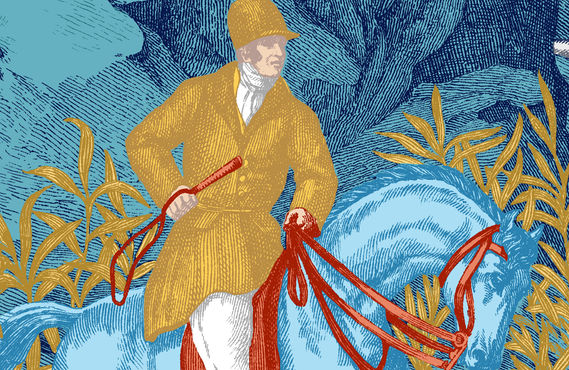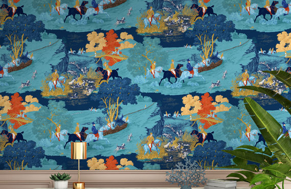 Rare scène de grande vénerie où la quête de la meute aboutit par forcer un grand cerf dans un étang au pied d'une falaise. Ce dessin est magnifique par son mouvement et son amplitude avec un raccord de 1 mètre de hauteur et 0,76m de largeur sauté, il donne l'illusion d'un raccord droit de 152 cm. Il a été restauré dans chacun des détails de gravure. Les variantes de coloris vont des classiques frais aux teintes donnant des vibrations modernes et étonnantes.